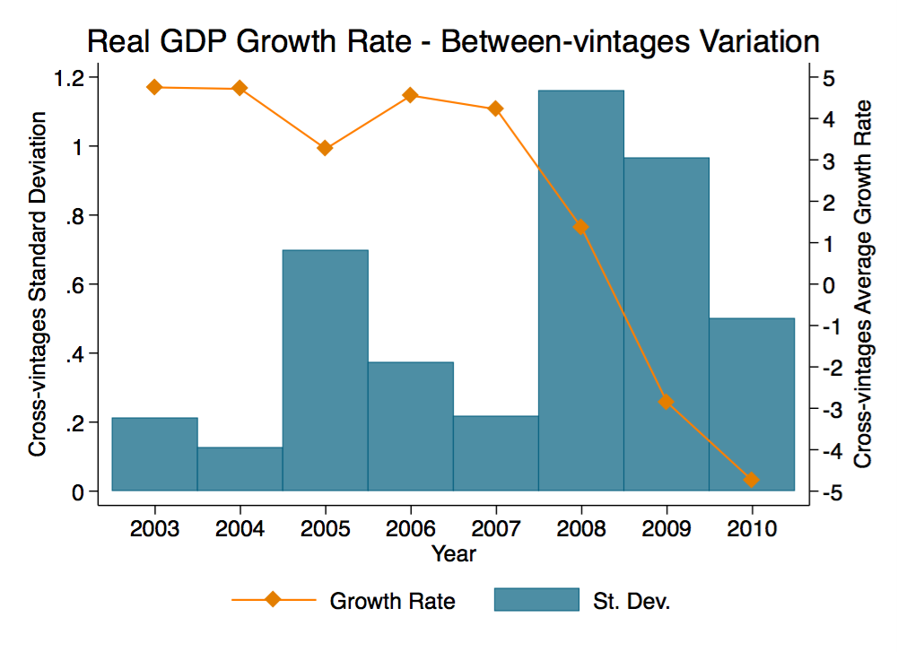 Figure 2. The orange line represents the real GDP growth rate averaged across vintages, while columns depict the cross-vintages standard deviations. Both statistics are computed using the first five data releases. We use October’s vintages from years between 2004 and 2012. In years 2013 and 2014 October’s vintages are not available, so the July and December’s vintages have been used, instead.