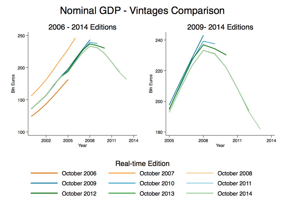 The swings in real GDP estimates are only in part due to revisions of the price indices. Figure 3 reports the nominal GDP estimates released between October 2006 and October 2014 and shows that the nominal series is not immune to changes across years. The differences between October 2006 and 2007 and the other real time editions is striking, but as the second panel shows more recent data are far from being consistent.