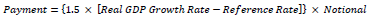 In March 2012 Greece signed a debt-restructuring deal in a context of a Private Sector Involvement (PSI) in which part of the existing debt was swapped to a new contract and linked to GDP performances. Considering this as a relevant precedent, we take into consideration the payment scheme adopted at that time as a reference. Following Zettelmeyer, Trebesch and Gulati (2013), the annual payments are computed on October 15 for the preceding year. Payments are made only if (i) nominal GDP in the preceding year exceeds some reference amount and (ii) real GDP growth exceeds some reference rate and is non-negative. If these conditions are met, the annual payment is computed as follows: